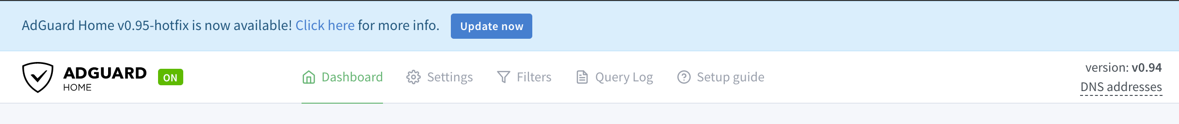and the “Update Now” button. Click this button, and AdGuard Home will be