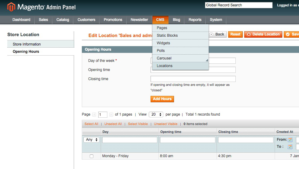 - Really nice Adminhtml grid with day of the week sorting, store location - opening hour relations, image preview and everything
