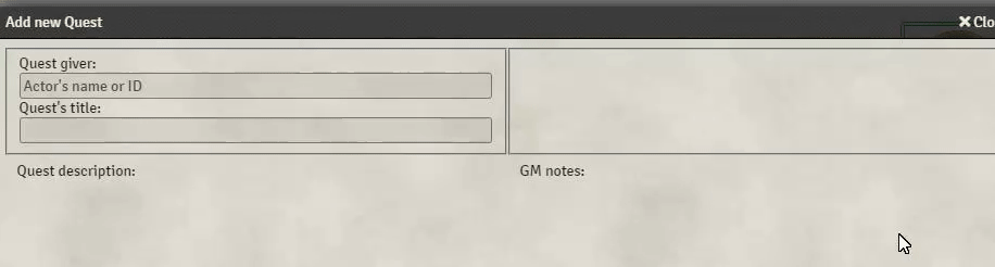 Creating a quest is limited to defining quest title, description, GM notes and any number of tasks. You can also assign any Actor as a quest giver, either by typing in exact name, ID, or dragging Actor onto proper spot.