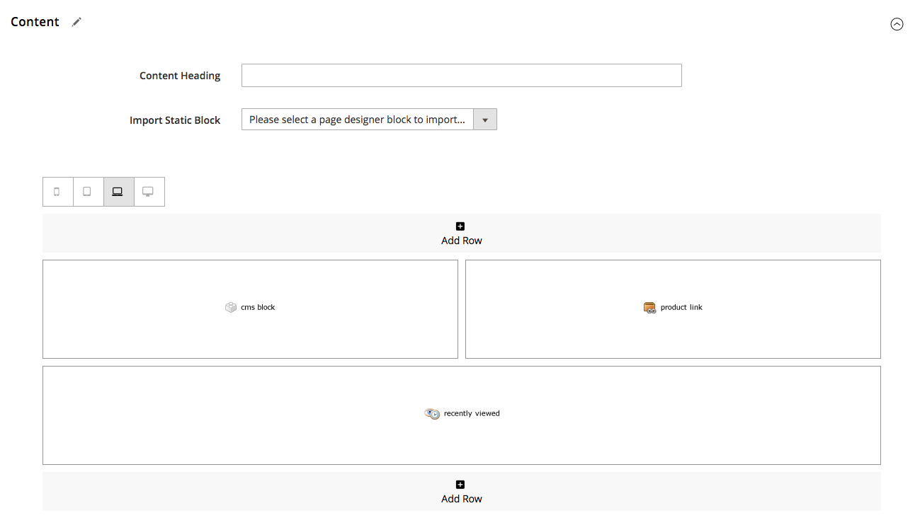 The page designer can be used for cms blocks and cms pages. Add a new block/page or edit an existing one.