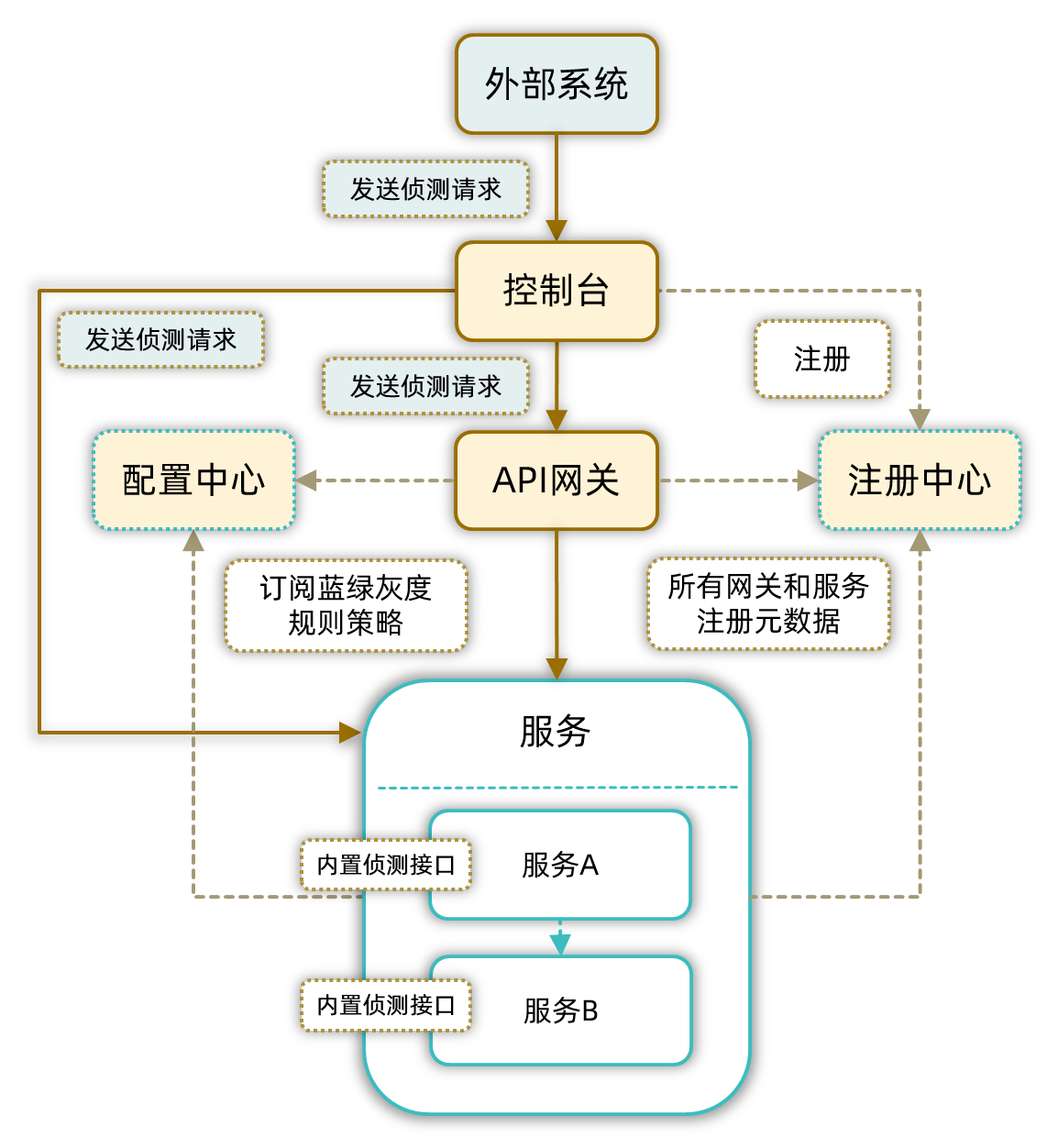 采用全链路智能编排 + 流量侦测相结合的做法,支持网关和服务为侦测入口两种方式,用于测试环境或者开发环境通过自动化测试手段验证全链路蓝绿灰度方式的准确性