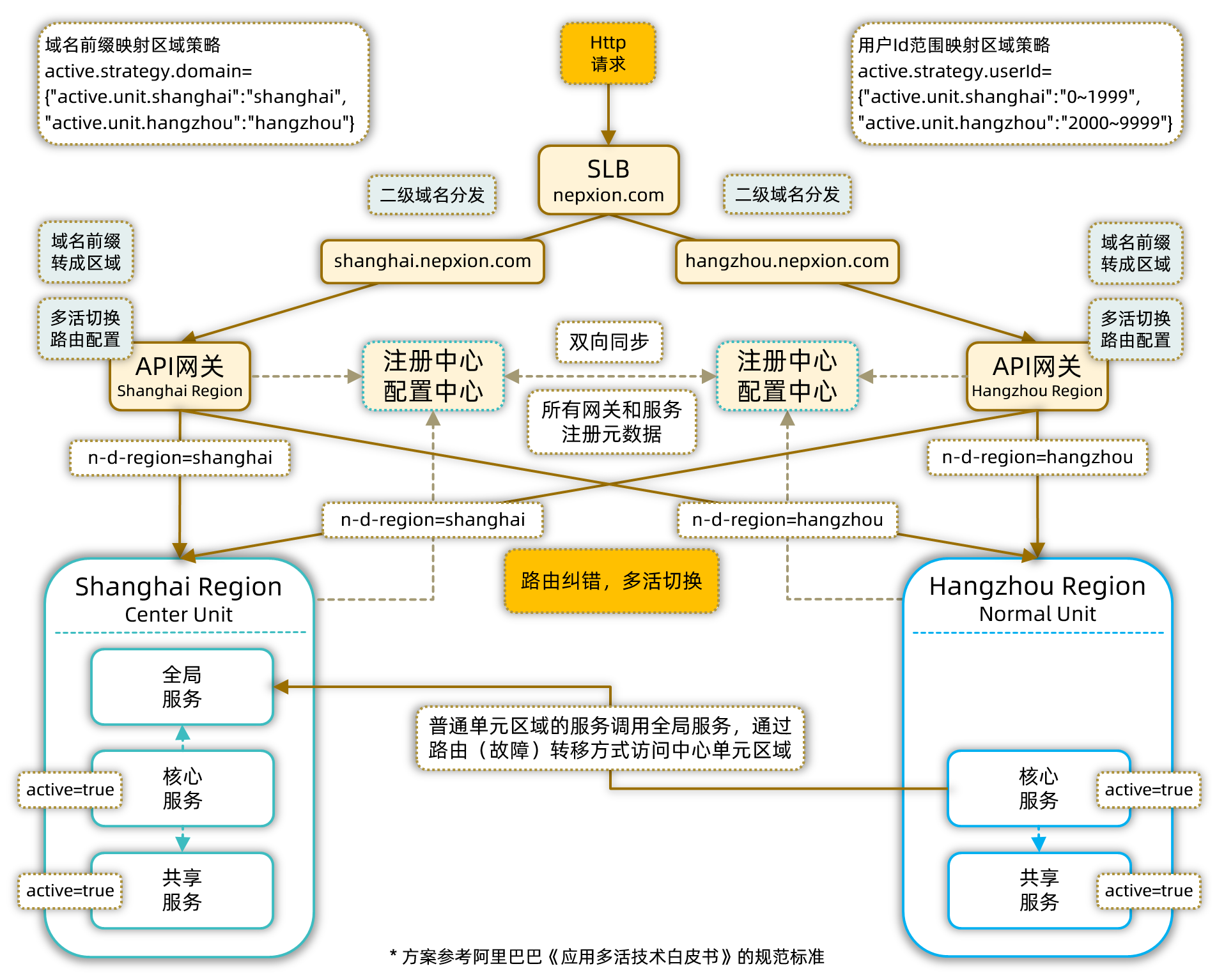 表示域名前缀为shanghai的请求路由到shanghai单元区域,域名前缀为hangzhou的请求路由到hangzhou单元区域。如果hangzhou单元区域遭遇故障,转移到shanghai,修改"active.unit.hangzhou":"shanghai",完成多活切换