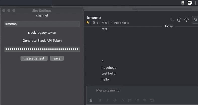 On a settings window, please set channel name you'd like to post and your slack legacy token (slack bot token is also available, but message author is marked at bot apps name.) After that, press the save button, and then press message test button to test posting a message to slack
