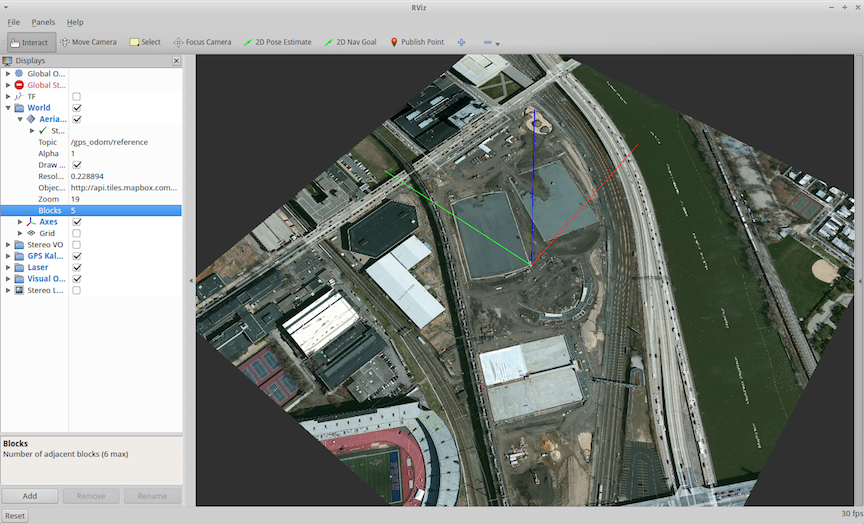 Topicis the topic of the GPS measurements.Robot frameshould be a TF from the robot position to the fixed frame.Dynamically reloadwill cause imagery to reload as the robot moves out of the center tile. This will only work if the robot frame is specified correctly by TF.Alphais simply the display transparency.Draw Underwill cause the map to be displayed below all other geometry.Zoomis the zoom level of the map. Recommended values are 16-19, as anything smaller is very low resolution. 22 is the current max.Blocksnumber of adjacent blocks to load. rviz_satellite will load the central block, and this many blocks around the center. 8 is the current max.Frame Conventionis the convention for X/Y axes of the map. The default is maps XYZ to ENU, which is the default convention for libGeographic and ROS.