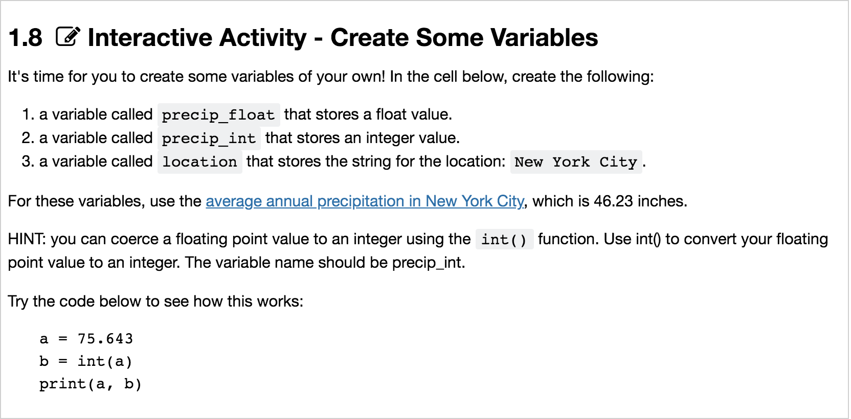 <img width="832" alt="Screen Shot 2021-04-12 at 10 50 06 AM" src="https://user-images.githubusercontent.com/16786791/114431604-ea0e7c80-9b7c-11eb-97bb-988dead91ca9.png"> In the HINT there is some text that could be converted to coded text: `int( )` rather than int() in the 2nd sentence `precip_int` rather than precip_int in the 3rd sentence