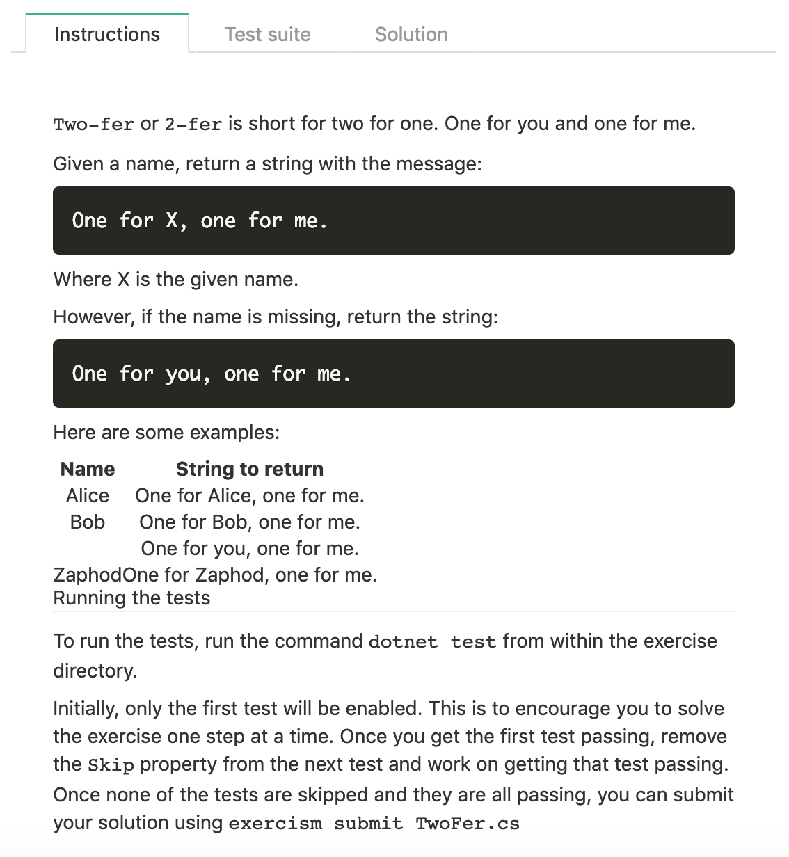 The table table with examples in the two-fer readme is center aligned this is not very readable. This PR makes the table left aligned.