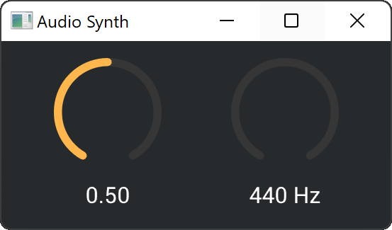 cx.add_theme(THEME);And that's it! If we run our app now and press the Z key to play the tone we can now change the amplitude and frequency of the tone using the two knobs, even while the tone is playing. Note that we don't have any smoothing in place so sudden changes in amplitude or frequency may cause a crackling sound.