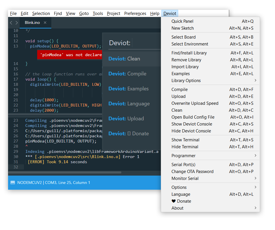 Deviot is a plugin inspired in stino, it's compatible with Sublime Text 3 and uses the PlatformIO ecosystem, which supports more than 450 boards.