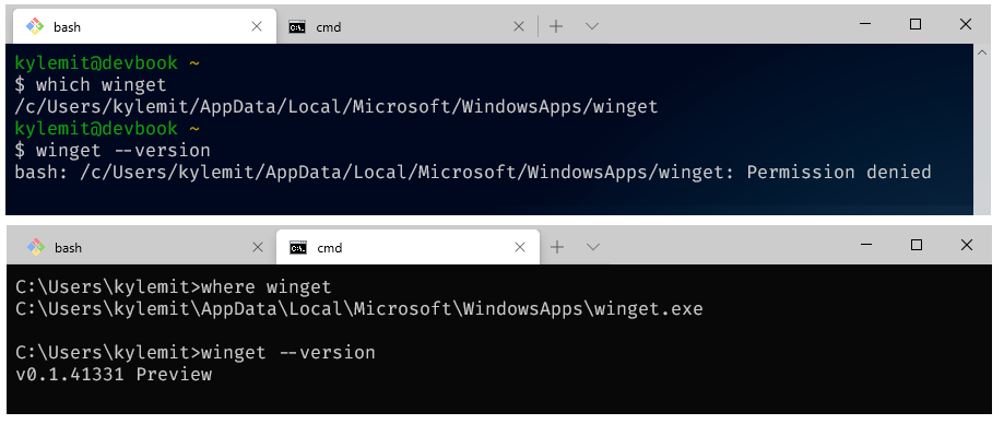 bash: /c/Users/kylemit/AppData/Local/Microsoft/WindowsApps/winget: Permission denied -