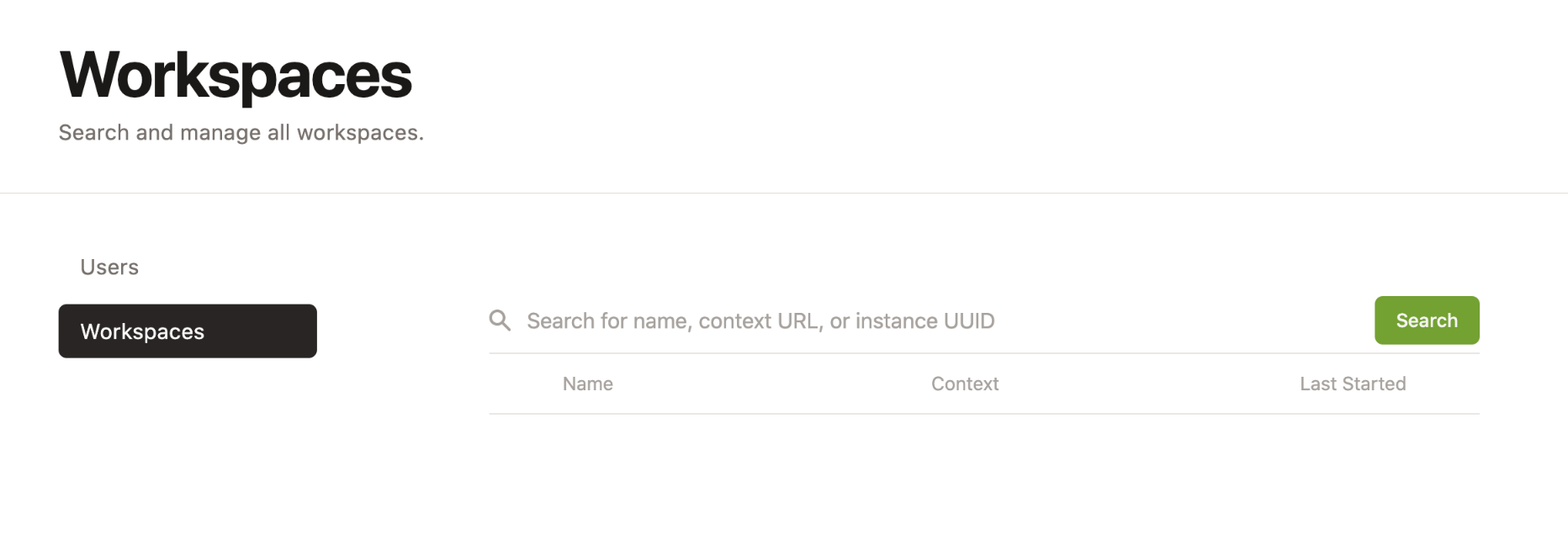 This extends the admin workspace search so that besides searching for the context url you can for the Workspace ID or Workspace Instance ID.