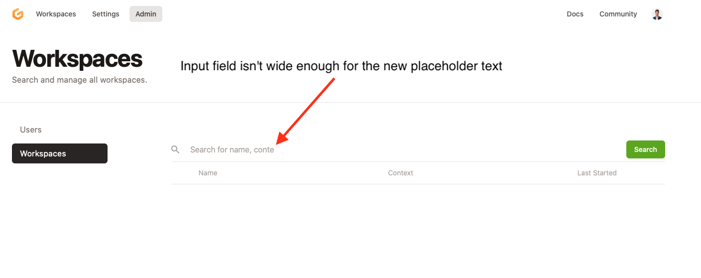 * Extend workspace admin search Extend search conditions to include instance UUID and workspace ID Fixes gitpod-io#3992 * Update placeholder Co-authored-by: George Tsiolis <[email protected]> * Use title capitalisation for placeholder test Co-authored-by: Cornelius A. Ludmann <[email protected]> Co-authored-by: George Tsiolis <[email protected]> Co-authored-by: Cornelius A. Ludmann <[email protected]>