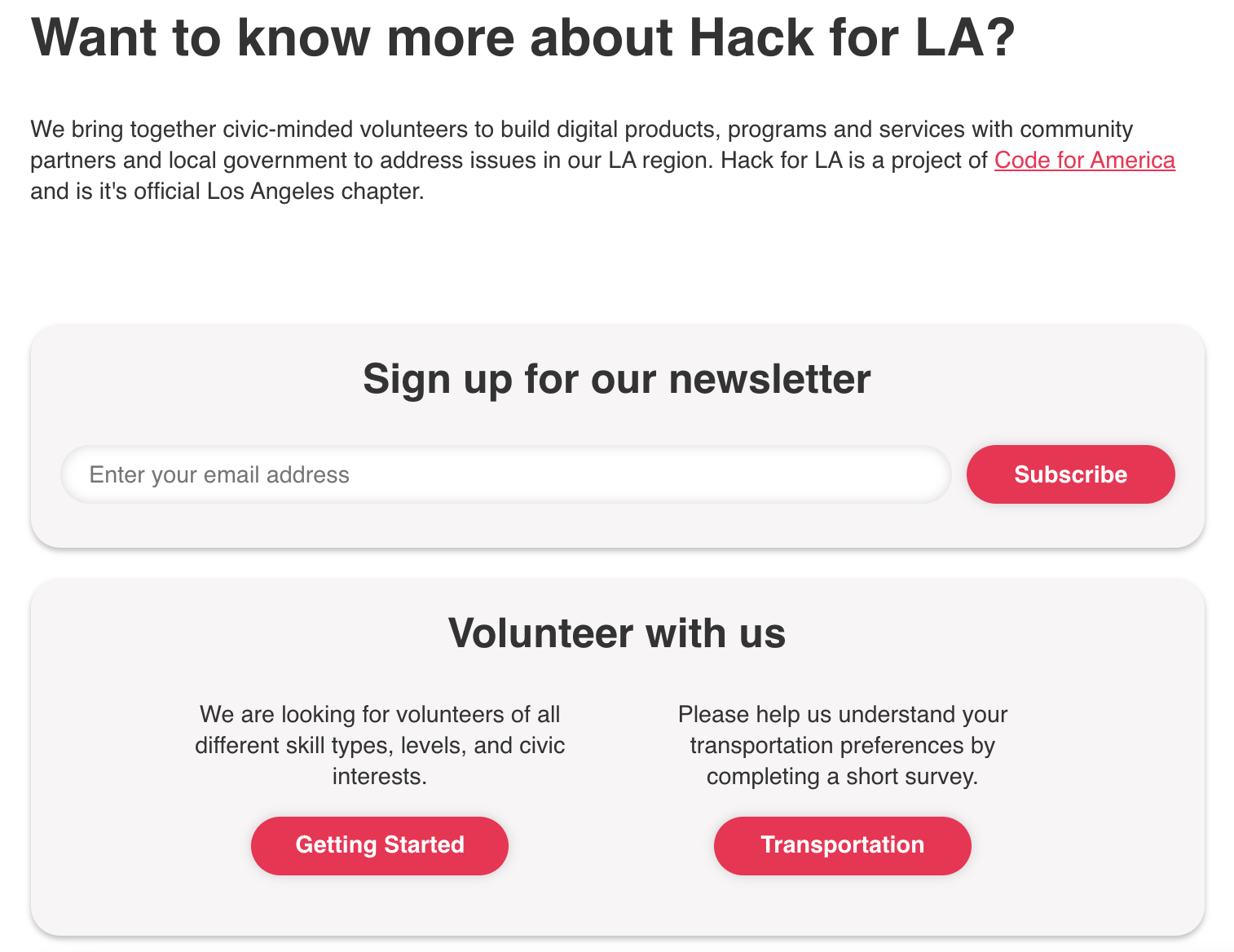 Complexity: SmallTake this type of issues after the successful merge of your second good first issueTake this type of issues after the successful merge of your second good first issueDependencyAn issue is blocking the completion or starting of another issueAn issue is blocking the completion or starting of another issueP-Feature: Home pagehttps://www.hackforla.org/https://www.hackforla.org/manual dependency releaserole: front endTasks for front end developersTasks for front end developerssize: 1ptCan be done in 4-6 hoursCan be done in 4-6 hours