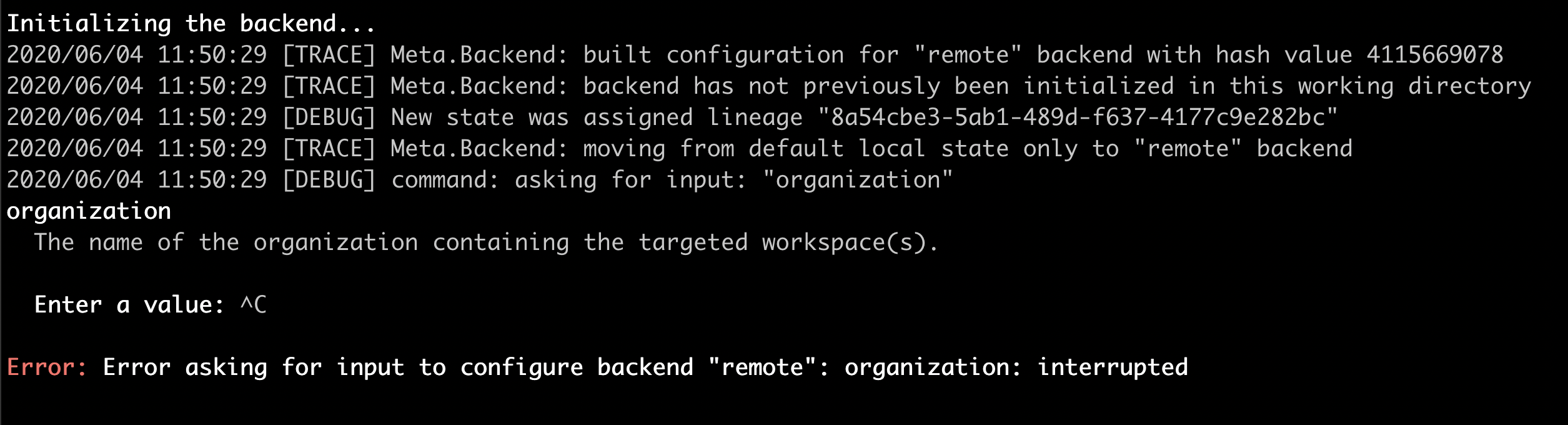 If a user cancels (ctrl-c) terraform init while it is requesting missing