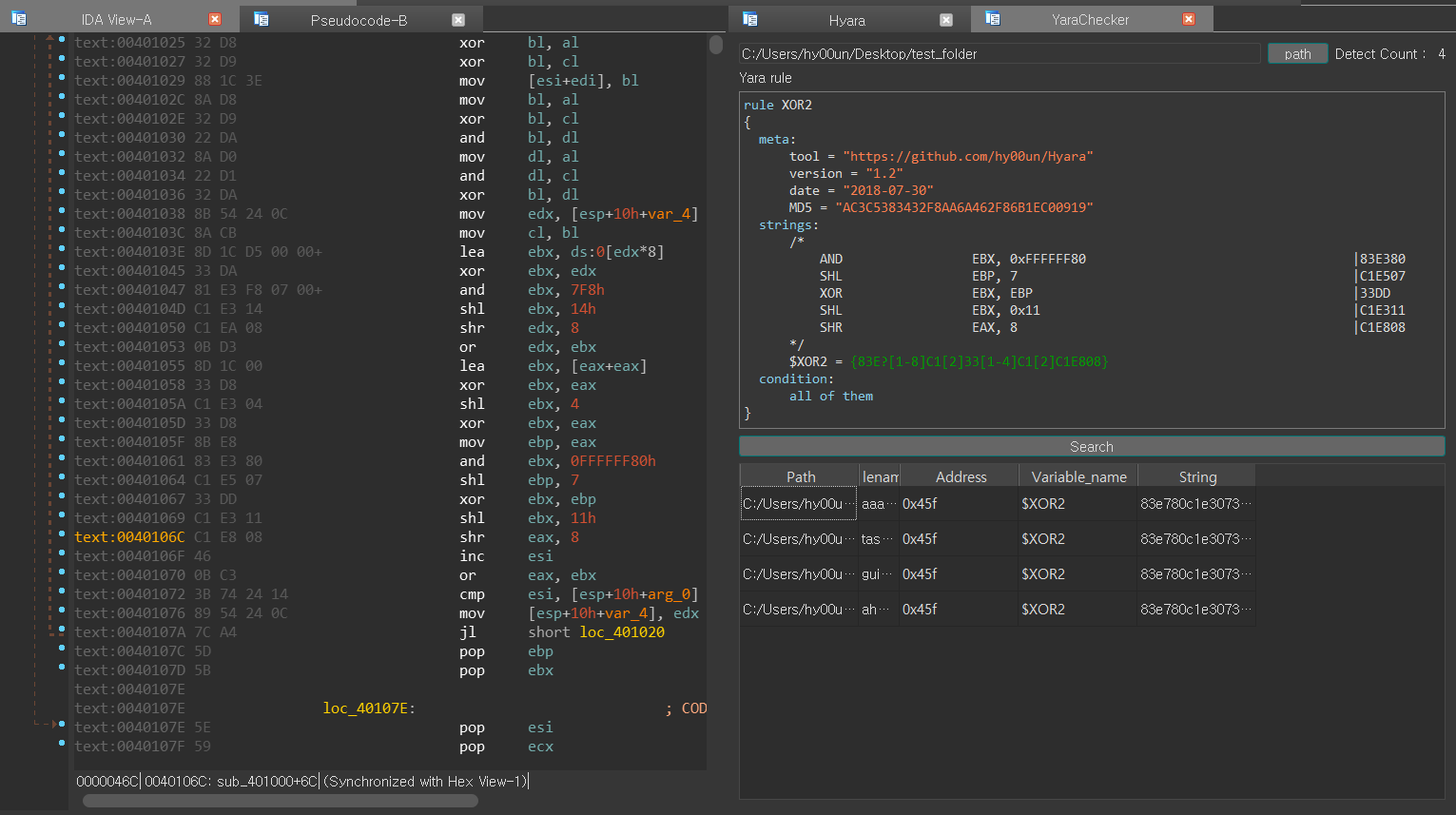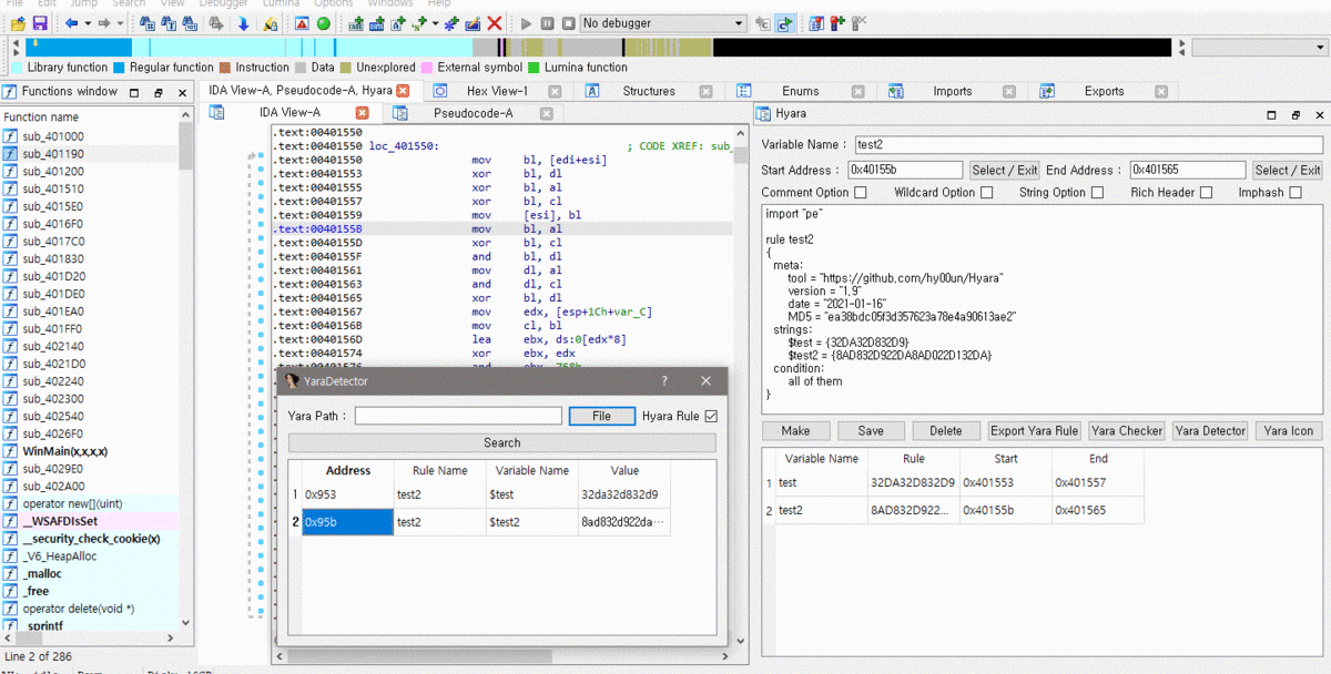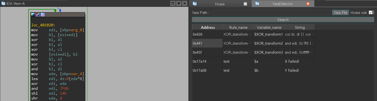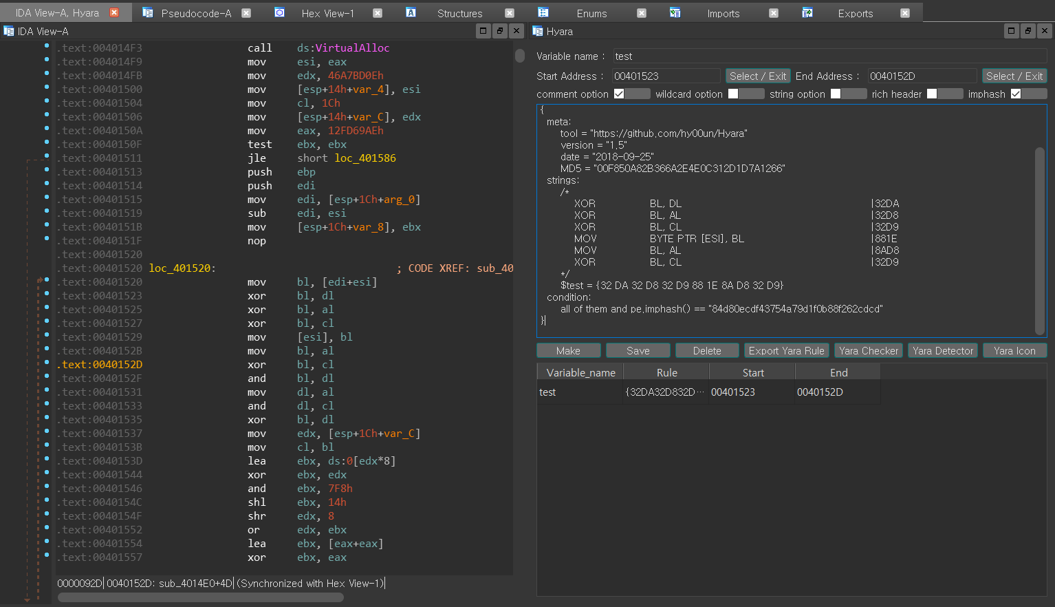 Hyara_IDA.py and hyara_lib folderto $ida_dir/plugins - Activate via Edit -> Plugins -> Hyara (or CTRL+SHIFT+Y)