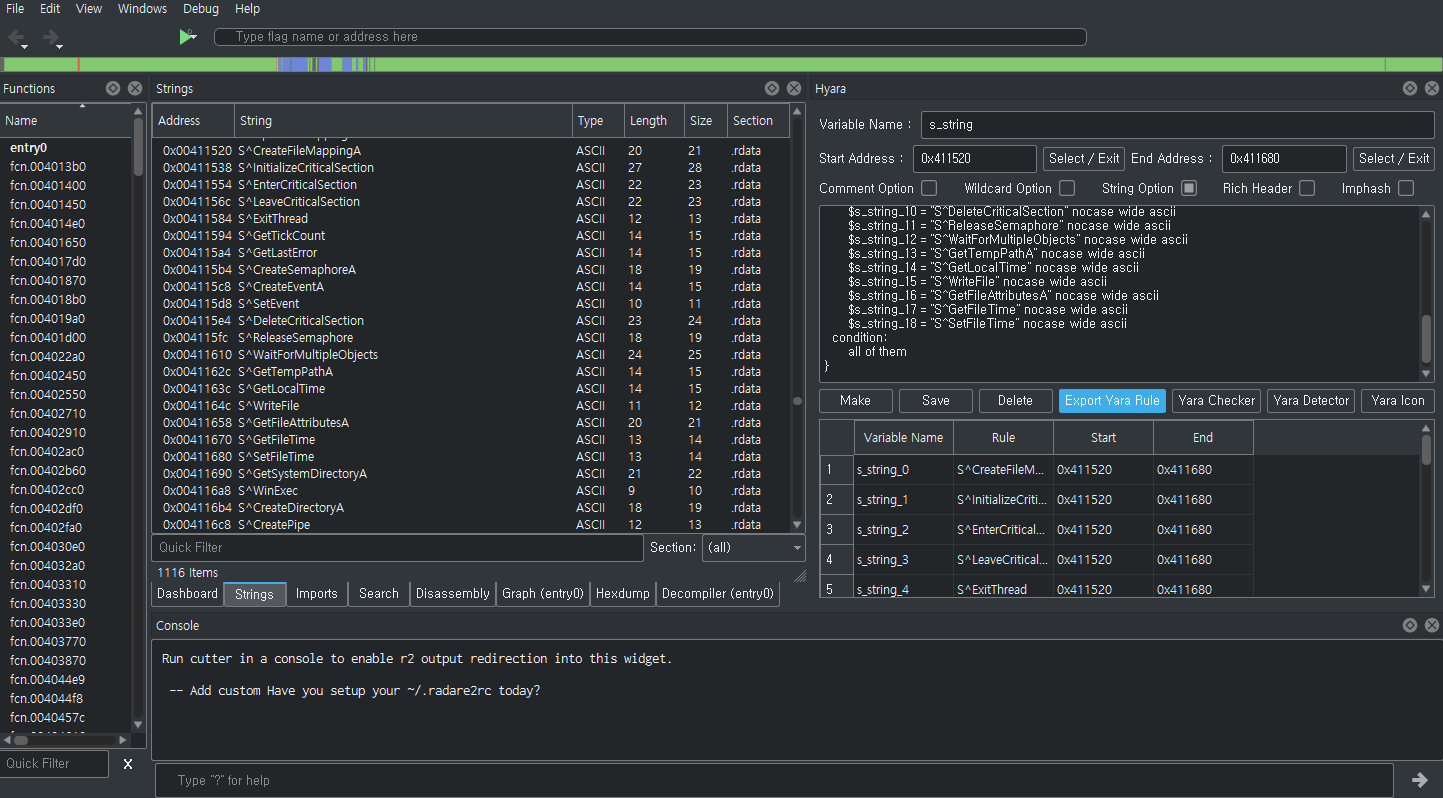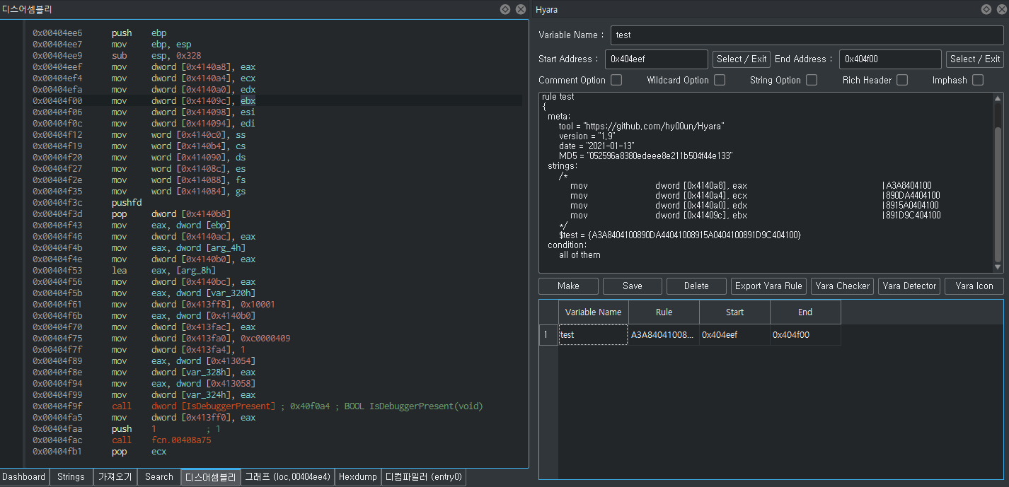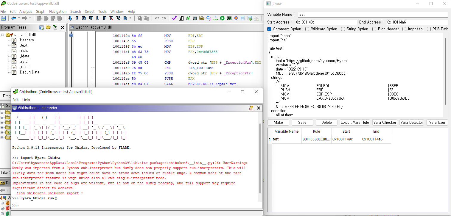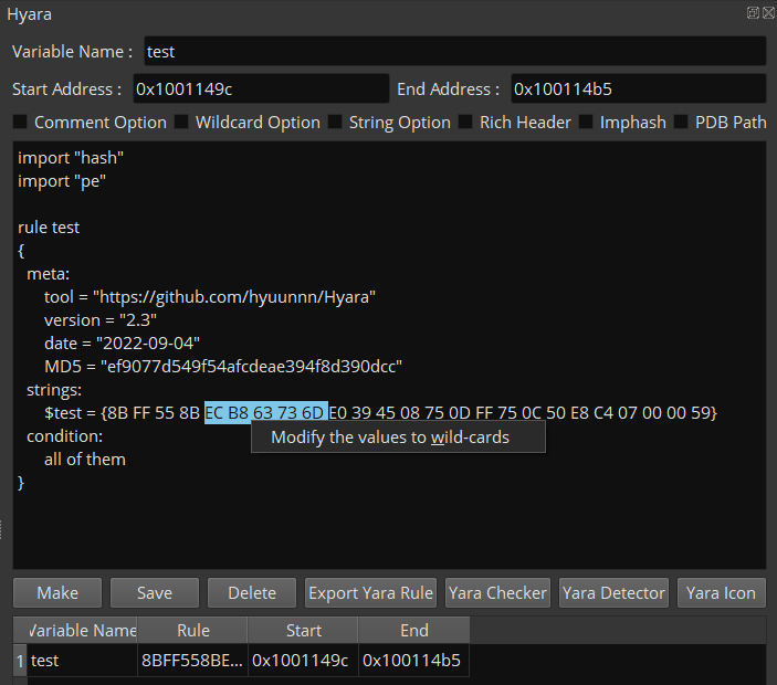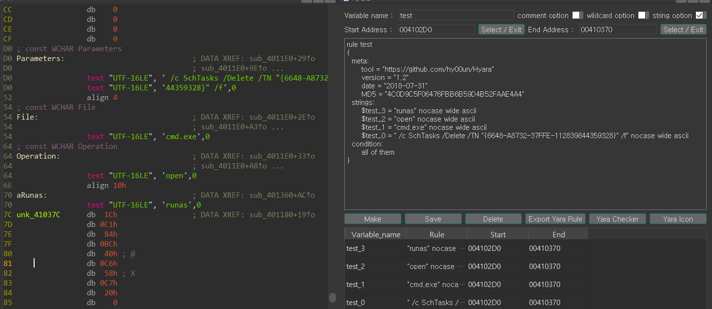Hyara_IDA.py and hyara_lib folderto $ida_dir/plugins - Activate via Edit -> Plugins -> Hyara (or CTRL+SHIFT+Y)