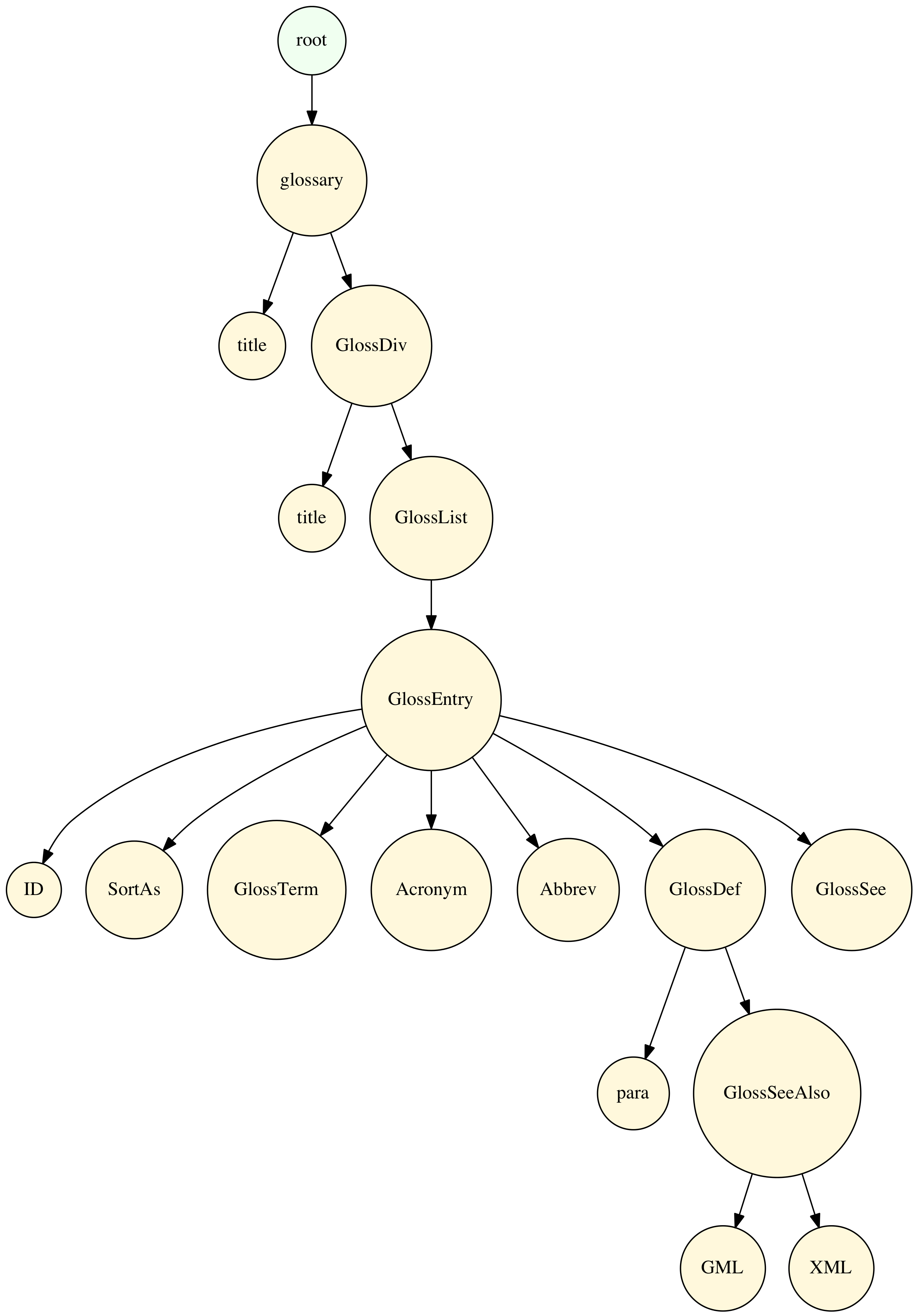 1 [shape=circle,fillcolor="cornsilk",style=filled,label="glossary"]