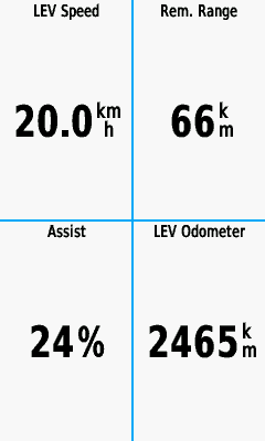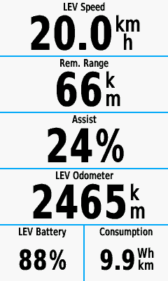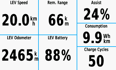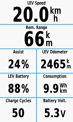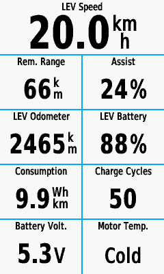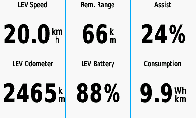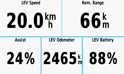 E-Bike Edge MultiField is a data field IQ Connect application for Garmin Edge devices, that displays up to 10 data fields from an ANT+ LEV (Light Electronic Vehicle) device. As separate data fields on the same screen cannot connect to an ANT+ LEV device or share its data, this data field renders its own grid system that mimics the native one in order to display multiple LEV fields.