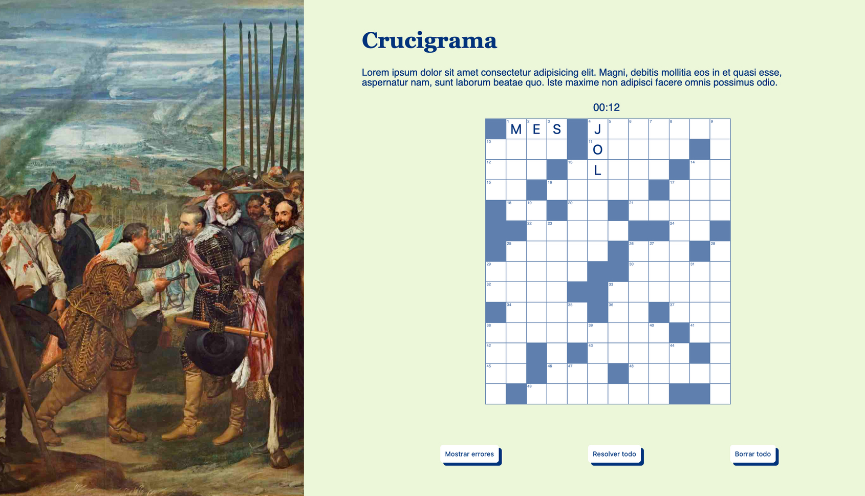 - Al pulsar el botón "mostrar errores", las letras del crucigrama que no coincidan con su pattern se mostrarán en rojo. Pulsando de nuevo el botón (ahora con el texto "ocultar errores") todas las letras serán de nuevo negras.