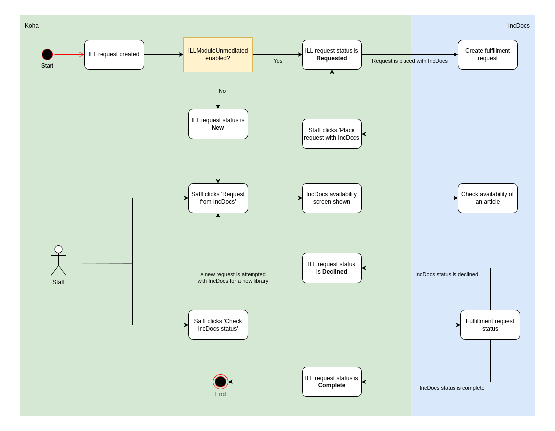 This backend utilizes the ILLModuleUnmediated system preference. If enabled, requests are placed with IncDocs as soon as they're created and are set to "Requested" status. Otherwise, requests are created with the "New" status and manual confirmation to place the request with IncDocs is required. This is only true for Staff created requests. Requests created from the OPAC always require mediation.