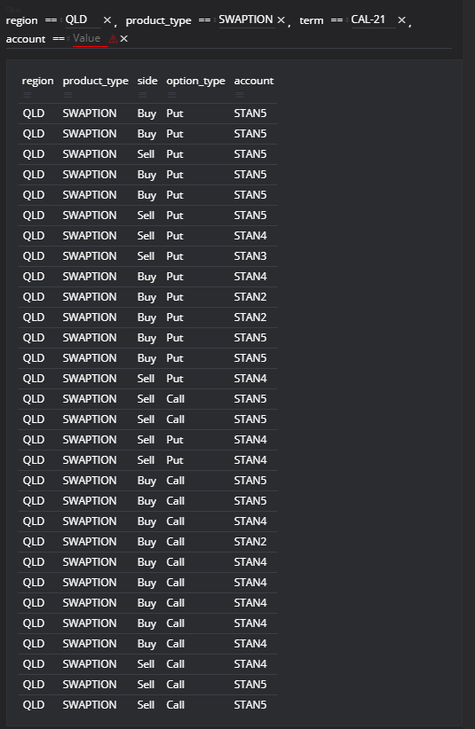 account == 'STAN2', table correctly updates showing onlySTAN2 - Filter