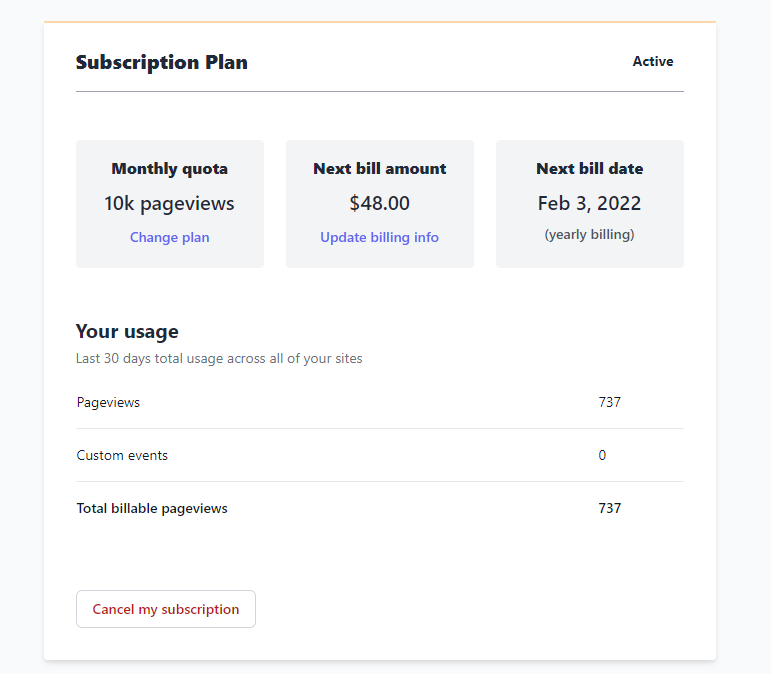 You can now download your invoices in your Plausible account. Log in to your Plausible account and in the top right menu, click on your account name and choose "Settings" to enter your account settings. To download your invoices, find the "Invoices" section. You'll see the list of your invoices and you can download the individual invoice by clicking on the link button. |