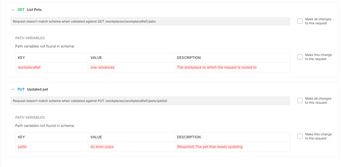 It cannot see that a path paramter exists in the schema that is referenced (it also appears to break the other items too) and causes a circular loop of fix the sync issues round and round.