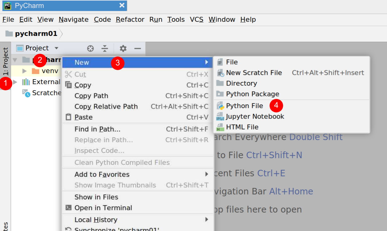 - To create a file, click on "Project", open the project's directory, and either user File → New... or right-click on it to open up the context menu and add a "Python File".