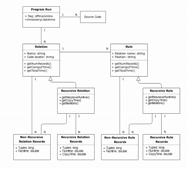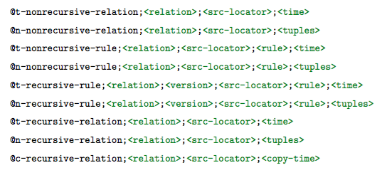 A Souffle Program consists of Non-Recursive and Recursive Relations which are made up of one or more Non-Recursive and Recursive Rules respectively. Recursive Rules and Recursive Relations execute in one or more Iterations. The performance characteristics of a Relation or Rule consists of the following: runtime, recursive runtime, non-recursive runtime, merge time and number of tuples produced. Recursive Rules can be made up of different versions.