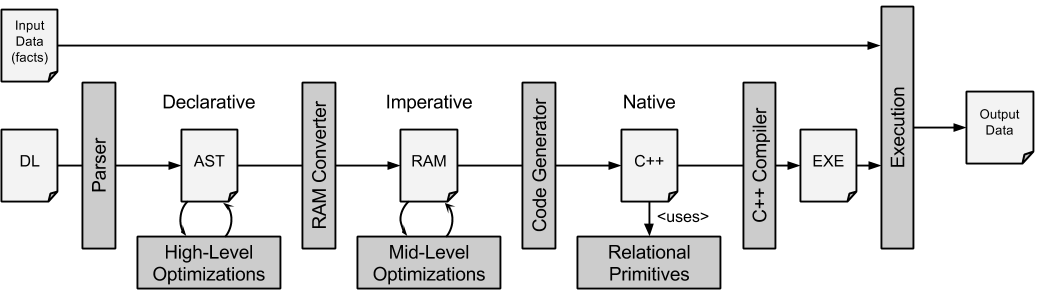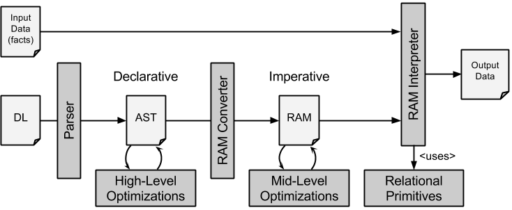 Finally, in the subsequent execution phase the RAM program, combined with a set of input facts, is interpreted step by step according to its imperative semantic. The necessary operations are supported by a set of algorithms and data structures offering relational primitives. The interpretation of a program starts by loading facts from a set of input files (fact files), followed by the conduction of the actual evaluation of the Datalog query and a final step of writing the content of selected relations to the selected output destination, e.g. output files, or the console.