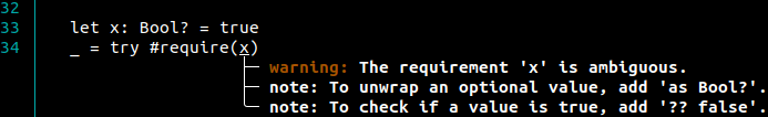 type `Bool?` will produce a diagnostic of the form: