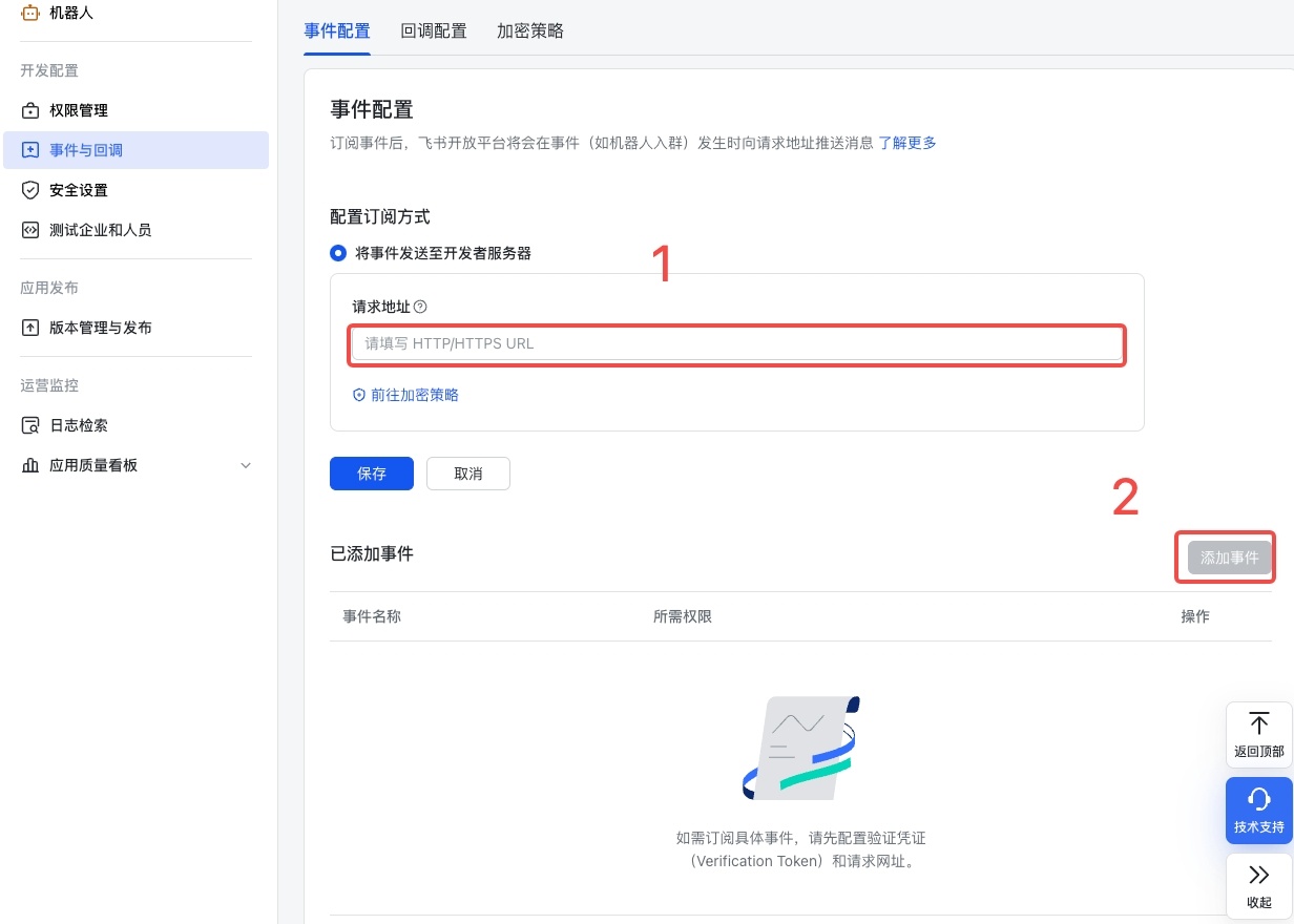 在事件与回调中配置订阅方式,以便将事件发送至开发者服务器;添加请求地址后,就可以添加事件, 在事件中我们选择im.message.receive_v1添加即可。
