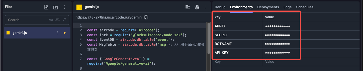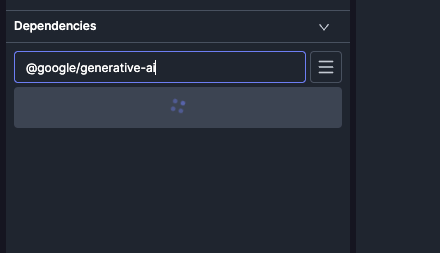 这个开发过程中,我们使用了飞书开放平台官方提供的 SDK,以及 axios 来完成调用。点击页面左下角的包管理器,安装 @larksuiteoapi/node-sdk 和 @google/generative-ai。