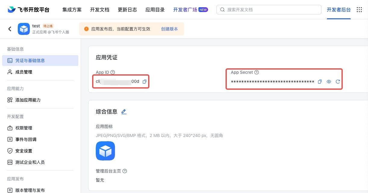 应用创建完成后,可以在凭证与基础信息中查看到App ID和App Secret,在下面的步骤中我们会用上。