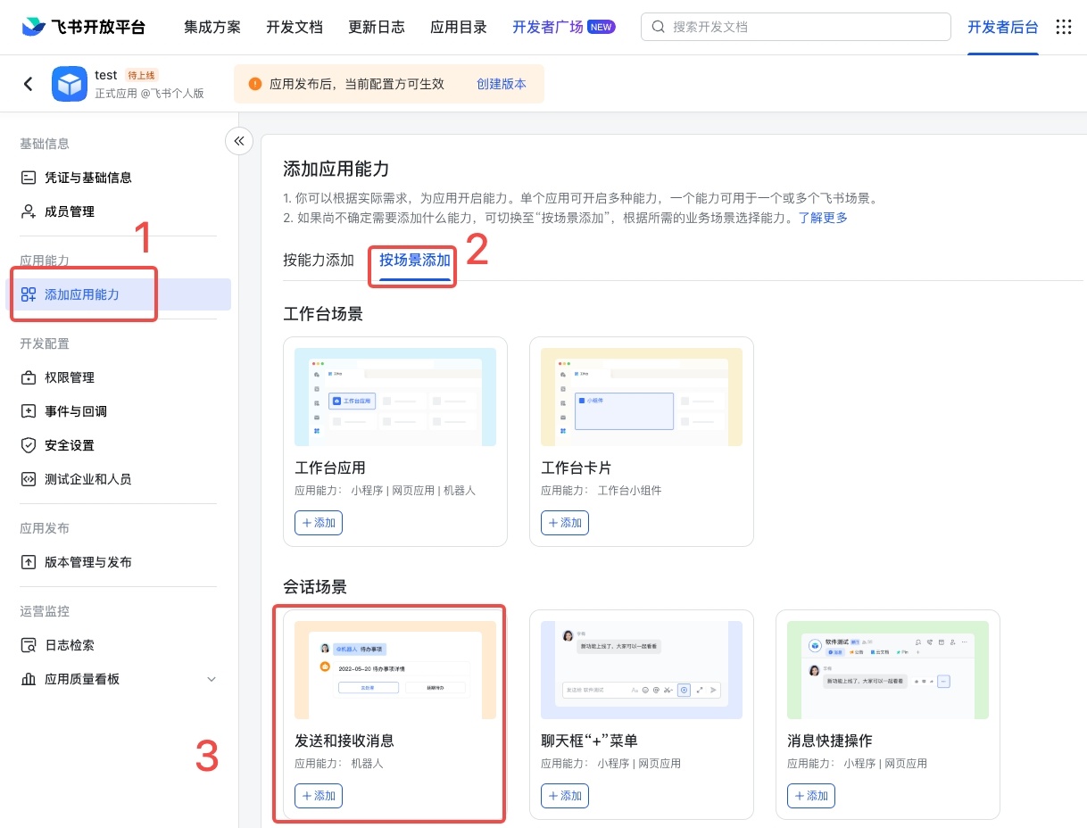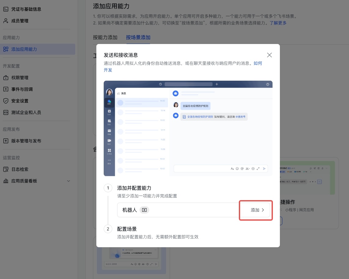 要实现机器人的对话功能,我们需要为创建的应用添加应用能力,开启会话场景下的发送和接受消息,添加完成后可以在左边添加应用能力下看到多了一个机器人