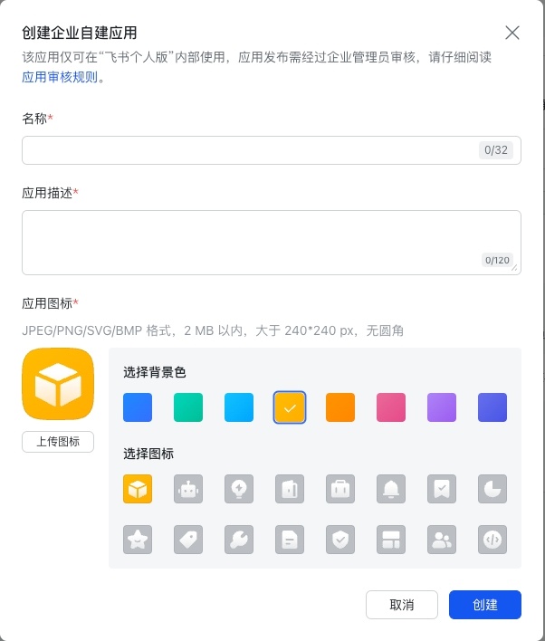 通过飞书开放平台后台,创建一个企业自建应用,设置好名称、描述、图标。